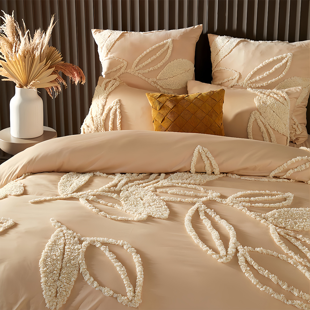 Create a warm and stylish bedroom with this embroidered duvet cover featuring an elegant tufted leaf pattern. Designed with raised chenille embroidery, this bedding set adds rich texture and a handcrafted look.